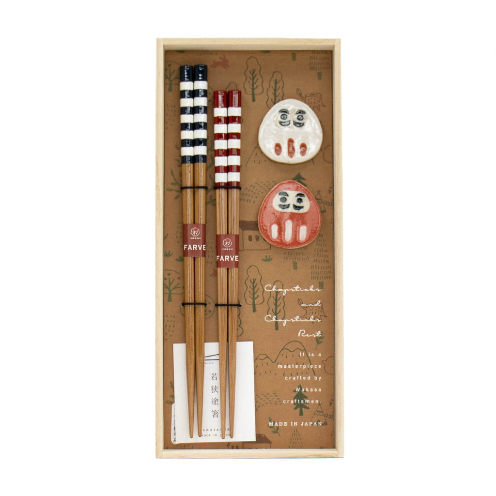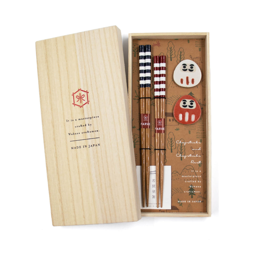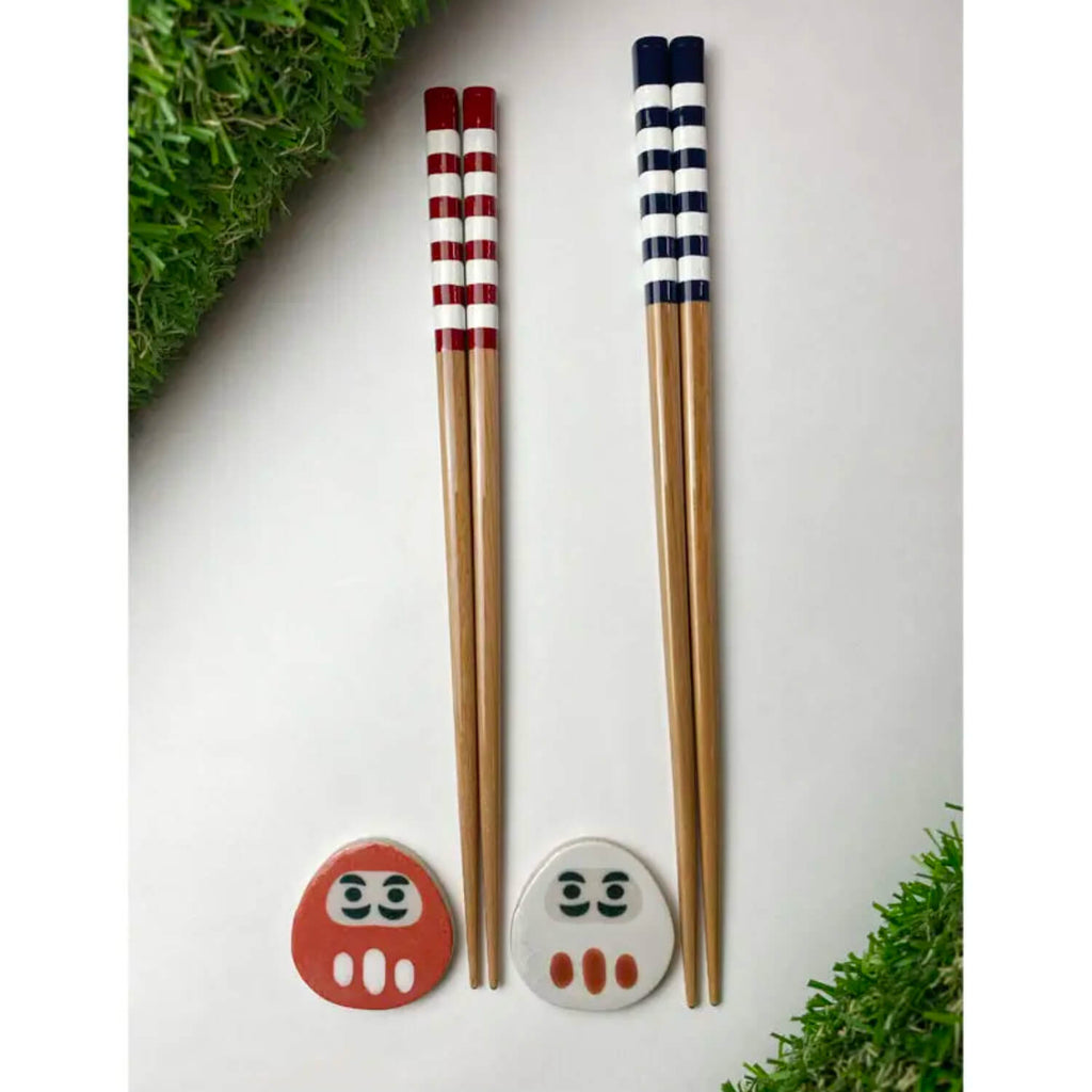 ダルマの箸置きと赤と紺のボーダーラインがデザインされたお箸のギフトセットです。