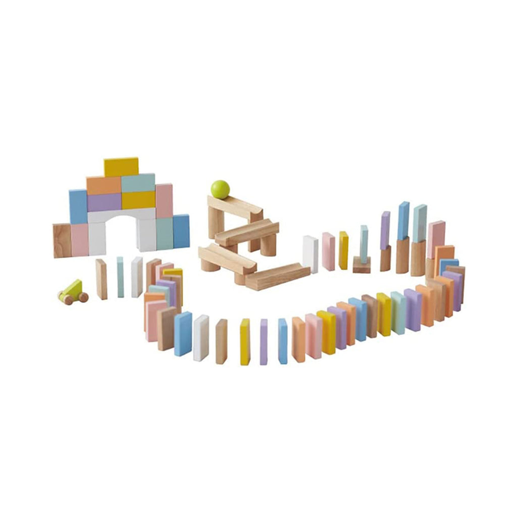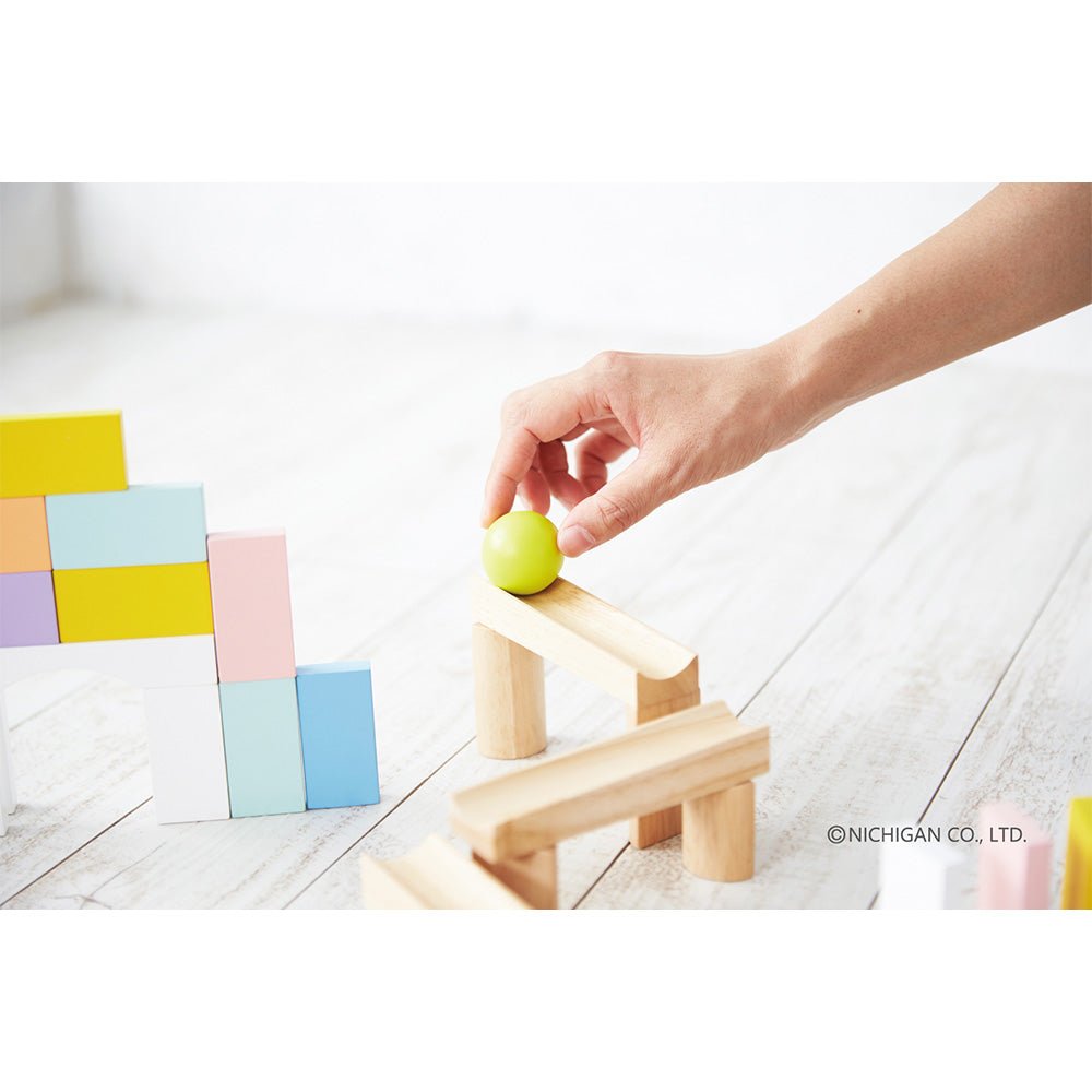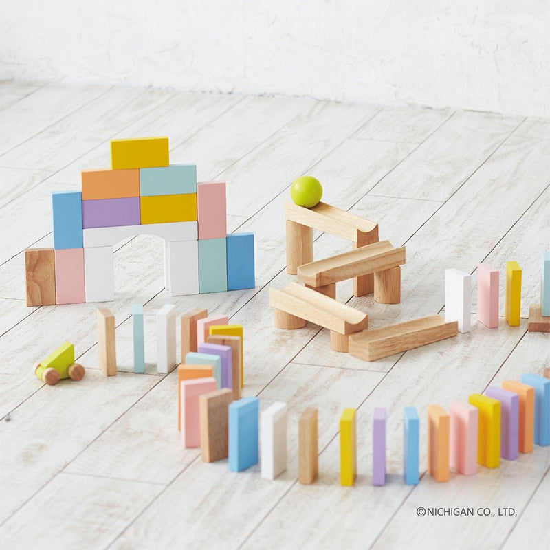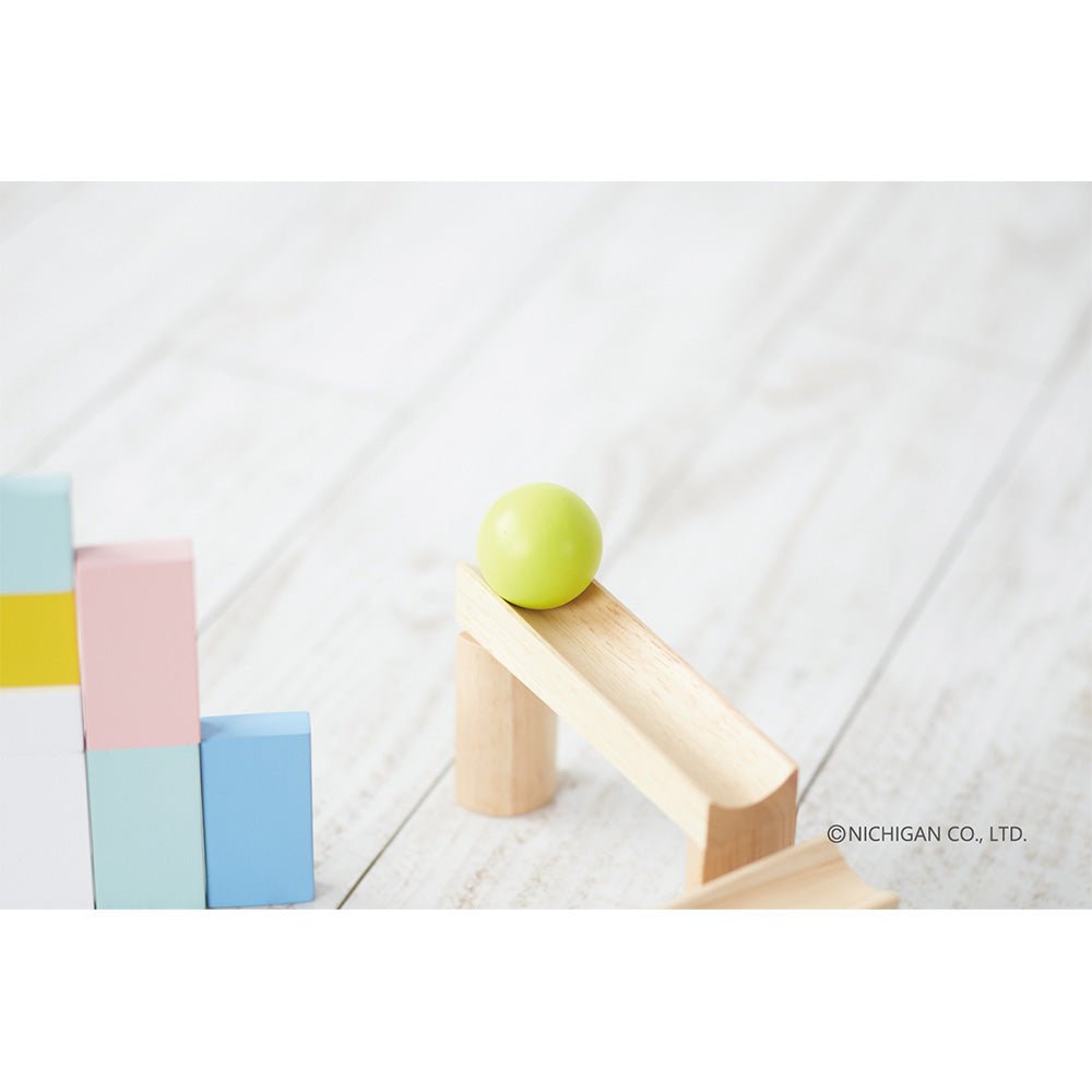 1つのコースを完成させることでの達成感や、うまく倒しきった時の爽快感はドミノならでは。玉がスロープからスロープにうまく転がった時や、ドミノが倒れる時の木と木のぶつかる音がなんともリズミカル優しい、音まで楽しめる玩具です。