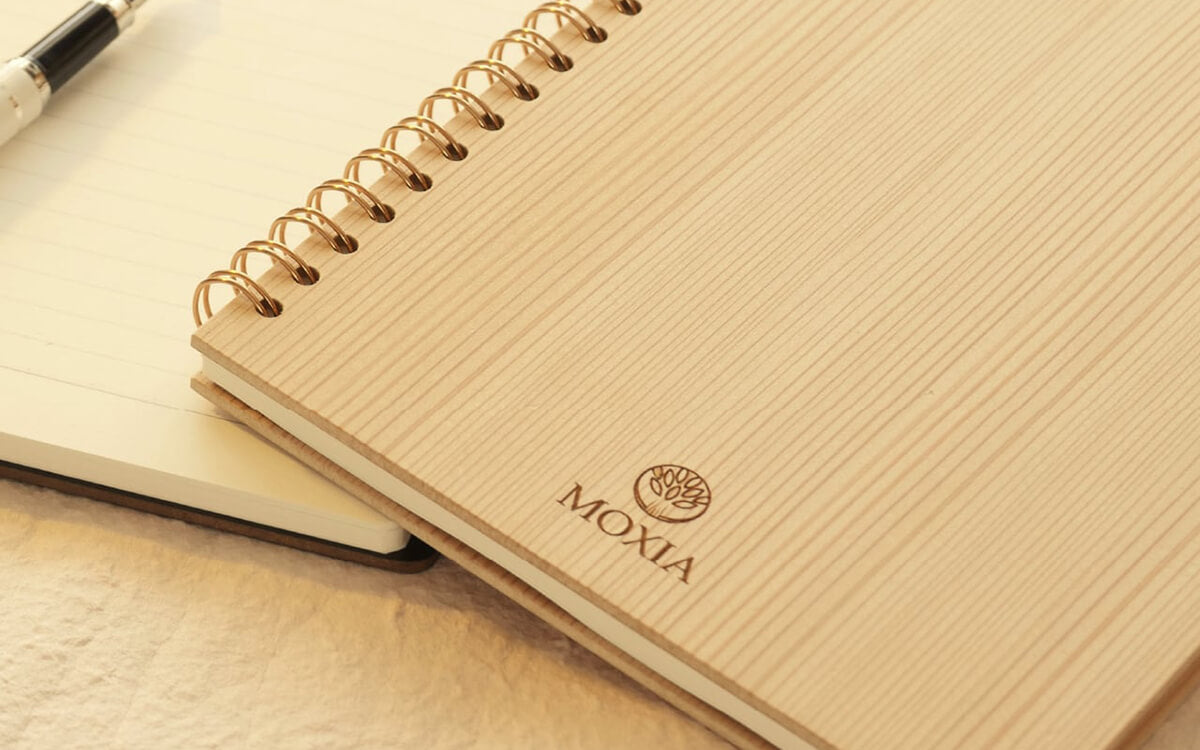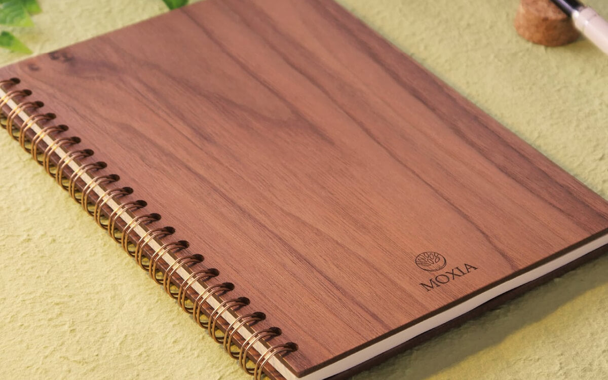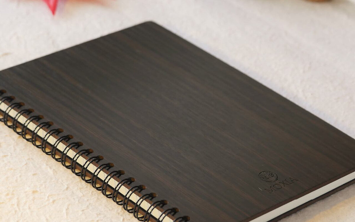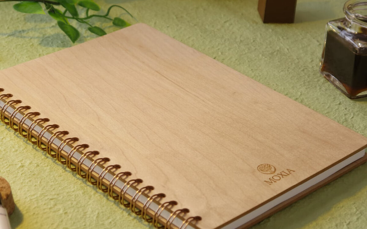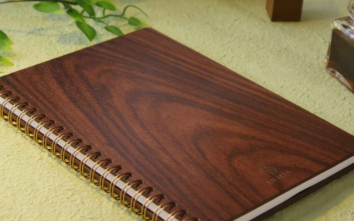 ハンドメイド仕上げの木製ノート。木材は経年変化によって、より美しい色合いや木目を楽しむことができます。