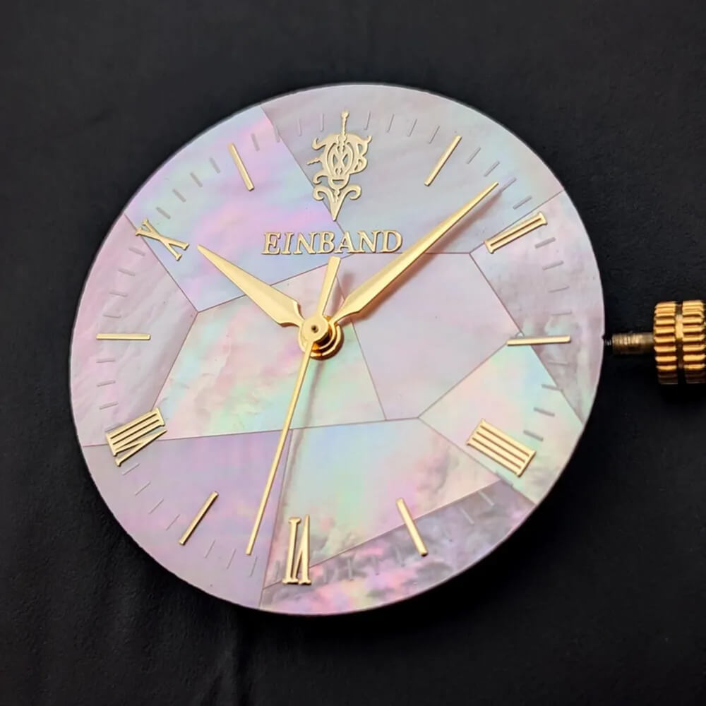 マザーオブパールをカットして、1枚1枚丁寧に貼り付けた文字盤となります。